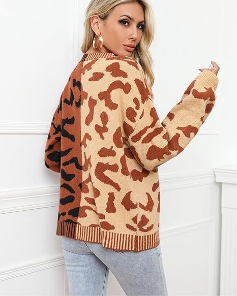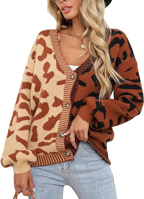 UEEKOOK Leopard Color Block Patchwork Women's Knit Cardigan Sweater Button Down Short Coat Outwear